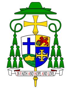 The Bishop’s personal arms were designed by Fr. Guy Selvester and Richard d’Apice AM KCSG, President of The Australian Heraldry Society. The Diocesan arms were designed by the late A. Ian Ferrier FBA. The arms have been illustrated by Sandy Turnbull also of the Australian Heraldry Society.