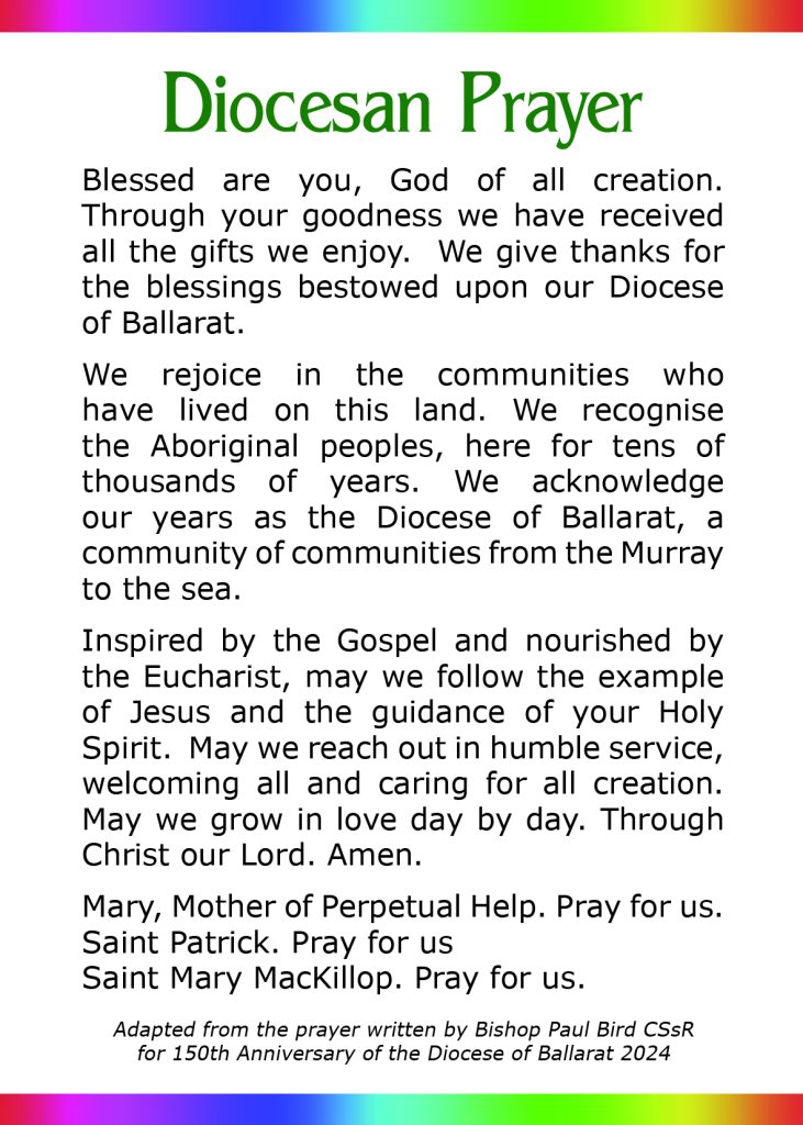 To mark the 150th Anniversary of the Diocese of Ballarat in 2024, Bishop Paul Bird composed a special Anniversary Prayer. Following a request from the Diocesan Liturgical Commission, Bishop Paul has now adapted this prayer to serve as an ongoing Diocesan Prayer. We encourage its use throughout the diocese as a unifying expression of faith and community.